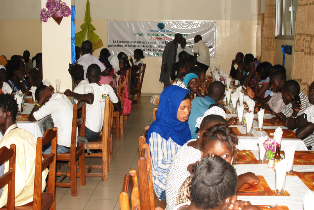 Le « Ndogu de Solidarité » avec les étudiants est une initiative de la Fondation, à l’occasion du mois béni du Ramadan. Il a été organisé avec l'appui de l'Association d’Entraide Notre Dame du Liban, Al Hoda, CAEDAS, de l’Ambassade de la République Algérienne et d’amis de l'Administratrice, notamment Marlène et Robert RAHMI et Ezzédine GHASS. Cette activité sociale a donc occasionné peu de frais pour la Fondation UCAD. A noter que M. Pierre NDIAYE, propriétaire du restaurant de l'UCAD II est Diplômé de l'UCAD. A ce titre, il s'est fortement impliqué pour la réussite de ce Ndogu. Le « Ndogu » a enregistré la participation des différentes associations d’étudiants invitées : UULD, Association des Étudiants Diabétiques, Association des Étudiants handicapés, Association des Etudiants Musulmans du Sénégal, Amicale des Étudiants Catholiques du Campus, Club Jeune Etudiant, FIREE, Kaay Débattre, Club de Sociologie, Association SEMETT, Mouvement des Étudiants Madibaristes, JVE, groupe Espoirs de la Banlieue. En outre, les personnes suivantes y ont pris part : Mme Aminata Fall NIANG et Mme Sokhna Diagne Ndiaye, membres du Conseil de Fondation, M. Mamadou NDIAYE, Médiateur de l'UCAD, le Docteur SANO du Service Médical du COUD et le Dr Mame Diarra NDIAYE. En outre, les personnes suivantes y ont pris part : Mme Aminata Fall NIANG et Mme Sokhna Diagne Ndiaye, membres du Conseil de Fondation, M. Mamadou Ndiaye, Médiateur de l'UCAD, le Docteur SANO du Service Médical du COUD et le Dr Mame Diarra NDIAYE. Le NDOGU s’est déroulé dans une ambiance très conviviale, selon le programme ci-après :